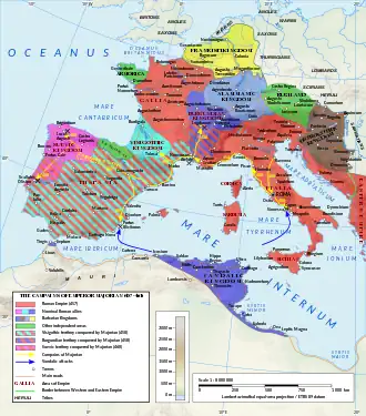 En 376, les Wisigoths, fuyant devant les Ostrogoths, qui à leur tour fuient devant les Huns, sont autorisés à traverser le Danube et à s'installer dans les Balkans par l'Empire romain d'Orient. Les mauvais traitements infligés aux réfugiés gothiques provoquent une rébellion à grande échelle et, en 378, ils infligent une défaite majeure à l'armée romaine orientale lors de la bataille d'Andrinople, au cours de laquelle l'empereur Valens est tué. La défaite d'Andrinople choque les Romains et les force à négocier avec les Wisigoths. Ceux-ci s'installent à l'intérieur des frontières de l'Empire, où ils deviennent des foederati semi-indépendants disposant de leur propre dirigeant[6]. Les guerres civiles romaines à la fin du IVe siècle, ainsi que les périodes de tensions entre les cours impériales des empires romains d'Orient et d'Occident, permettent aux Wisigoths menés par Alaric Ier de devenir une force majeure dans la politique de l'Empire, de moins en moins soumise au gouvernement romain[4]. L'arrivée des Wisigoths dans les Balkans est suivie par les Alains, les Vandales et les Suèves qui migrent en Gaule entre 405 et 407 lors de la traversée du Rhin[4]. Les barbares du Rhin sont contenus par l'empereur usurpateur Constantin III (407-411), mais la fin de son règne en raison d'un nouveau conflit interne romain permet aux tribus de pénétrer profondément en Gaule et en Hispanie[7].