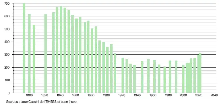 L'évolution du nombre d'habitants est connue à travers les recensements de la population effectués dans la commune depuis 1793. Pour les communes de moins de 10 000 habitants, une enquête de recensement portant sur toute la population est réalisée tous les cinq ans, les populations légales des années intermédiaires étant quant à elles estimées par interpolation ou extrapolation[23]. Pour la commune, le premier recensement exhaustif entrant dans le cadre du nouveau dispositif a été réalisé en 2004[24].