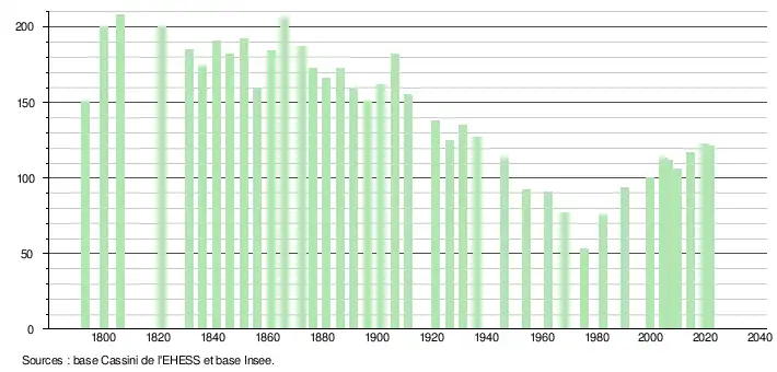 L'évolution du nombre d'habitants est connue à travers les recensements de la population effectués dans la commune depuis 1793. Pour les communes de moins de 10 000 habitants, une enquête de recensement portant sur toute la population est réalisée tous les cinq ans, les populations légales des années intermédiaires étant quant à elles estimées par interpolation ou extrapolation[26]. Pour la commune, le premier recensement exhaustif entrant dans le cadre du nouveau dispositif a été réalisé en 2004[27].
