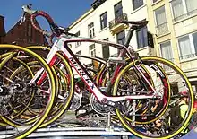 Ce vélo de l'équipe Topsport Vlaanderen-Baloise photographié lors de la Flèche brabançonne 2015 à Louvain a son guidon entouré de guidoline.