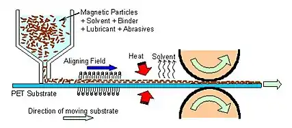La bande magnétique est formée d’un support en plastique fin sur lequel on peut déposer, par exemple, une poudre d’oxyde ferrique (Fe2O3) mélangée à un liant de fixation ainsi qu’un lubrifiant sec. Cet oxyde ferrique est un matériau ferromagnétique, c’est-à-dire que sous l’application d’un champ magnétique, elle devient aimantée de façon permanente (haute rémanence).