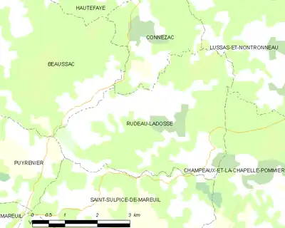 Rudeau-Ladosse est limitrophe de trois autres communes, Connezac au nord, Lussas-et-Nontronneau au nord-est et Mareuil en Périgord à l'est, au sud-est, au sud, au sud-ouest, à l'ouest et au nord-ouest.