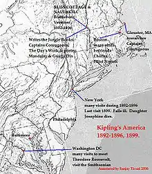 Le , Kipling quitta l'Inde, d'abord en direction de San Francisco en faisant escale à Rangoon, Singapour, Hong Kong et au Japon. Puis il traversa les États-Unis en rédigeant des articles pour The Pioneer qui devaient également paraître dans le recueil From Sea to Sea (D'un océan à l'autre). De San Francisco, Kipling fit route vers le nord jusqu'à Portland, dans l'Oregon; puis Seattle, dans l'État de Washington. Il fit une incursion au Canada, visitant Victoria, Vancouver et la Colombie-Britannique. Il revint ensuite aux États-Unis pour explorer le parc national de Yellowstone, avant de redescendre vers Salt Lake City. Ensuite, il prit la direction de l'est, traversant les États du Nebraska en s'arrêtant à Omaha, et de l'Illinois, s'arrêtant à Chicago. De là, il partit pour Beaver (Pennsylvanie), sur les rives de l'Ohio pour un séjour chez les Hill. Le professeur Hill l'accompagna ensuite à Chautauqua, puis aux chutes du Niagara, Toronto, Washington D.C., New York et Boston[20]. Il fit la connaissance de Mark Twain à Elmira (État de New York), devant lequel il se sentit fort intimidé. Puis il traversa l'Atlantique pour débarquer à Liverpool en . Quelques mois plus tard, il faisait des débuts remarqués dans le monde littéraire londonien[17].