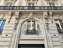 - entrée des portiques des Champs-Élysées, ensemble de galeries construit en 1928 pour relier la rue Arsène-Houssaye aux nos 144-146 avenue des Champs-Élysées et au no 21, rue Lord Byron[4].