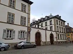 - Les changements successifs dans la numérotation laissent subsister quelques incertitudes, mais plusieurs sources[6],[7],[8]indiquent que la maison curiale se trouvait tout près du pont. Puis venaient la boulangerie et les greniers du Chapitre (pistrinum et granarium, 1210) et enfin la trésorerie, nommée Zum Eselskopf (« À la Tête d'Àne »), mentionnée en 1401. Ces maisons ont successivement porté les nos 5 et 6, puis 1 et 9 et enfin 1 et 3[7].