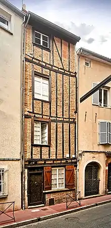 L'immeuble en corondage est peut-être élevé au XVIe siècle. La façade étroite ne compte qu'une seule travée. Elle est construite en pan de bois couvert d'enduit. Les quatre niveaux sont séparés par des cordons en bois[9].
