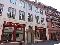 - Ancienne auberge, la maison est acquise en 1763 par le notaire Jean-Frédéric Lobstein, qui y fait ajouter un portail de style rococo strasbourgeois[1], influencé par le décor du Palais Rohan. La porte est encadrée par deux pilastres lisses, à agrafes légèrement dissymétriques, qui supportent un arc en plein cintre surbaissé. Elle est surmontée par une fenêtre d'imposte en forme d'oculus, entourée de deux rinceaux de feuillages se terminant par une volute dont l'ornement est creusé et découpé comme un coquillage[4].