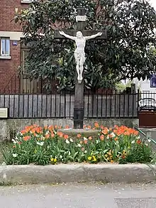- Au croisement de la rue de Merlan, se trouve une croix de carrefour[6]. Ce calvaire semble avoir été érigé en 1896, sur un terrain particulier en manière de protestation contre la délibération prise le par la municipalité de l’époque. Cette délibération ordonnait de « ... procéder à l’enlèvement des croix et calvaires élevés sur la voie publique (). » Furent ainsi supprimées, malgré l'opposition de la population : la croix Durin, rue de Pantin, la croix du bout de Brément et la croix des petits Noyers, rue d’Enfer. Le tollé soulevé auprès de la population fit que l'équipe municipale perdit les élections suivantes[7].