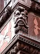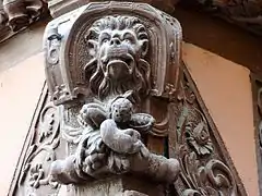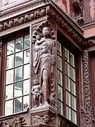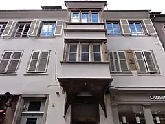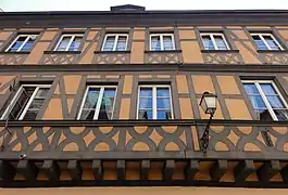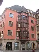 - Doté de pans de bois au riche décor antiquisant (statues de femmes, colonnettes et pilastres, frises d'oves et consoles à volutes[18]), cet oriel s'inspire directement de la maison Kammerzell, toute proche, et dont la façade venait de prendre son aspect définitif en 1589[19]. L'immeuble actuel date de 1951-1953[20].