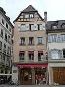 - À l'angle du no 15 de la place de la Cathédrale, cette grande maison bourgeoise médiévale, à deux étages en encorbellement, mitoyenne de la maison Kammerzell qui se trouve au no 16 de ladite place, a été souvent transformée. Plusieurs inscriptions et dates gravées permettent d'en penser la chronologie et d'apprécier l'importance de cet édifice dont le décor Renaissance est la première manifestation de ce style à Strasbourg, selon la date de 1528 portée sur la console d'angle. C'est peut-être le cas également des motifs des pans de bois des allèges (restaurés en 1895), devenus fréquents à partir de la seconde moitié du XVIe siècle. On remarque en outre un monumental corbeau gothique, situé à proximité du no 24[17],[7]. Les éléments du Moyen Âge et de la Renaissance (tourelle d'escalier à vis, plafond stuqué, chambranles de portes, fenêtres et niches, peintures murales) font l'objet d'une inscription au titre des monuments historiques depuis 1988[36].