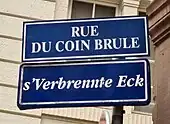 À partir de 1995, des plaques de rues bilingues, à la fois en français et en alsacien, sont mises en place par la municipalité lorsque les noms de rue traditionnels étaient encore en usage dans le parler strasbourgeois[5]. Le nom de la rue est ainsi sous-titré s'Verbrennte Eck.