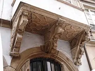 L'immeuble Renaissance à oriel adjacent – qui portera ultérieurement le nom de « maison Simonis[2] » –, est daté de 1575, selon le millésime gravé sur les cartouches des montants du deuxième étage[3]. Les consoles et le dessous de l'oriel sont ornés d'une grande variété de motifs sculptés, rosaces et étoiles, dont l'étoile des brasseurs à six branches. Au XVIIIe siècle, les deux arcades du rez-de-chaussée sont fermées[3], un escalier baroque à balustres et feuillage[1], dit « à la française », est construit[9].