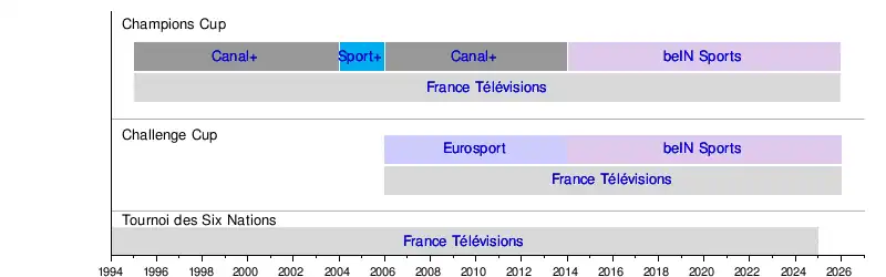 | France Télévision et Canal+ | 1992-1995 | France Télévision acquiert le les droits de diffusion du championnat de France de rugby à XV jusqu'en 1994-1995[33]. Le championnat était diffusé sur France 2 et France 3 puis co-diffuse avec Canal+[45]. |