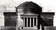 - Friedrich von Gärtner dessine un bâtiment circulaire avec une grosse coupole avec un trou en son centre. Cette ébauche est extrêmement semblable à celles qui serviront à construire le Befreiungshalle de Kelheim quelques années plus tard. Les sources d'inspirations sont classiques avec en premier lieu le Panthéon de Rome, la coupole avec son orifice en étant bien sûr directement inspirée[7].