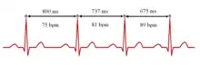 La fréquence cardiaque est le nombre de battements cardiaques (ou pulsations) par unité de temps (généralement la minute). C'est une notion quantitative qui peut aussi se définir en nombre de cycles par seconde, par l'inverse de la période.La notion de rythme cardiaque est équivalente[2] et est parfois comprise de façon plus qualitative.