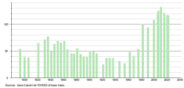 L'évolution du nombre d'habitants est connue à travers les recensements de la population effectués dans la commune depuis 1793. Pour les communes de moins de 10 000 habitants, une enquête de recensement portant sur toute la population est réalisée tous les cinq ans, les populations légales des années intermédiaires étant quant à elles estimées par interpolation ou extrapolation[17]. Pour la commune, le premier recensement exhaustif entrant dans le cadre du nouveau dispositif a été réalisé en 2005[18].