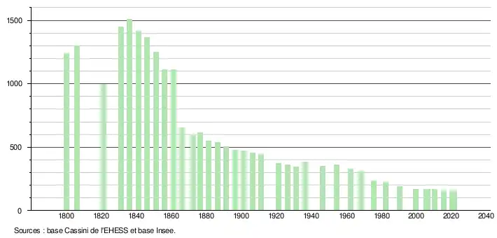L'évolution du nombre d'habitants est connue à travers les recensements de la population effectués dans la commune depuis 1800. Pour les communes de moins de 10 000 habitants, une enquête de recensement portant sur toute la population est réalisée tous les cinq ans, les populations légales des années intermédiaires étant quant à elles estimées par interpolation ou extrapolation[22]. Pour la commune, le premier recensement exhaustif entrant dans le cadre du nouveau dispositif a été réalisé en 2005[23].