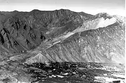 Photographie du glissement de terrain recouvrant partiellement le village de Khait après le séisme.