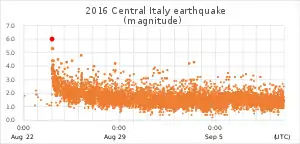 Le à 1 h 36 min 33 s UTC, un séisme de magnitude 6,2 secoue la haute vallée du Tronto, notamment la province de Rieti (Latium) et celle d'Ascoli Piceno (Marches) et, dans une moindre mesure, les régions voisines de l'Ombrie et des Abruzzes, en Italie centrale[1]. Il cause la mort de 298 personnes [2], dont 234 rien qu'à Amatrice[3], et fait près de 400 blessés[4].