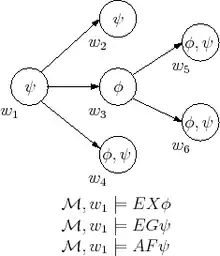 La sémantique de la logique CTL utilise une relation d'accessibilité R de proche en proche, qui à chaque instant relie les instants suivants possibles. C'est la relation d'accessibilité de la modalité universelle AX et de sa modalité existentielle associée EX :