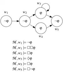 De manière informelle, la formule de la logique modale est définie comme étant vraie dans un monde w si et seulement si est vraie dans tous les mondes accessibles depuis w. La formule est vraie dans un monde w si et seulement s'il existe un monde w' accessible depuis w tel que soit vraie dans le monde w' .