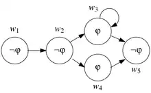 - En logique doxastique, les mondes accessibles depuis le monde w sont les mondes qui sont compatibles avec les croyances d'un agent se trouvant au monde w. Par exemple, si l'agent i croit uniquement que est vraie (), alors les mondes accessibles seront ceux où est effectivement vraie. Comme la relation n'est en général pas réflexive, le monde w n'est pas forcément accessible, donc n'y est pas forcément vraie, ce qui modélise bien le fait que l'agent peut se tromper sur la réalité du monde dans lequel il est (ce monde actuel n'est pas forcément compatible avec ses croyances).