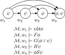 On introduit souvent les modalités binaires (until, jusqu'à) et (since, depuis), qui apportent énormément d'expressivité au langage[1]. signifie que est vraie jusqu'à ce que soit vraie, et signifie que a été vraie depuis que ne l'est plus. La caractérisation de leur sémantique est la suivante :