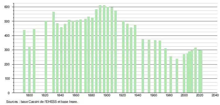 L'évolution du nombre d'habitants est connue à travers les recensements de la population effectués dans la commune depuis 1793. Pour les communes de moins de 10 000 habitants, une enquête de recensement portant sur toute la population est réalisée tous les cinq ans, les populations légales des années intermédiaires étant quant à elles estimées par interpolation ou extrapolation[21]. Pour la commune, le premier recensement exhaustif entrant dans le cadre du nouveau dispositif a été réalisé en 2004[22].