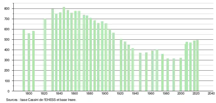 | L'évolution du nombre d'habitants est connue à travers les recensements de la population effectués dans la commune depuis 1793. Pour les communes de moins de 10 000 habitants, une enquête de recensement portant sur toute la population est réalisée tous les cinq ans, les populations légales des années intermédiaires étant quant à elles estimées par interpolation ou extrapolation[30]. Pour la commune, le premier recensement exhaustif entrant dans le cadre du nouveau dispositif a été réalisé en 2007[31]. En 2021, la commune comptait 495 habitants[Note 7], en augmentation de 4,65 % par rapport à 2015 (Tarn : +1,82 %, France hors Mayotte : +1,84 %). |