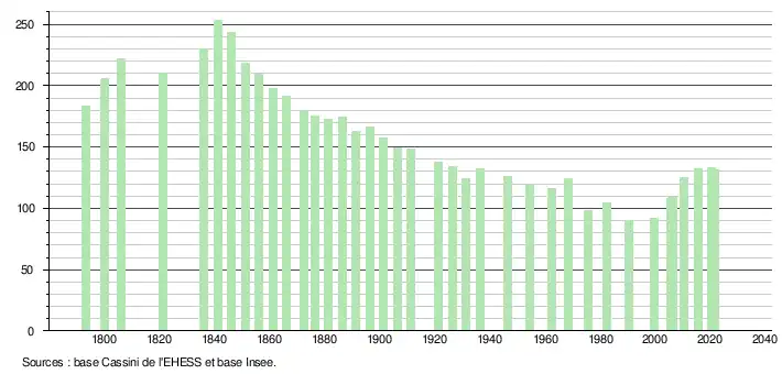 L'évolution du nombre d'habitants est connue à travers les recensements de la population effectués dans la commune depuis 1793. Pour les communes de moins de 10 000 habitants, une enquête de recensement portant sur toute la population est réalisée tous les cinq ans, les populations légales des années intermédiaires étant quant à elles estimées par interpolation ou extrapolation[22]. Pour la commune, le premier recensement exhaustif entrant dans le cadre du nouveau dispositif a été réalisé en 2005[23].