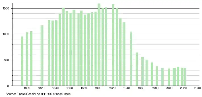 L'évolution du nombre d'habitants est connue à travers les recensements de la population effectués dans la commune depuis 1793. Pour les communes de moins de 10 000 habitants, une enquête de recensement portant sur toute la population est réalisée tous les cinq ans, les populations légales des années intermédiaires étant quant à elles estimées par interpolation ou extrapolation[23]. Pour la commune, le premier recensement exhaustif entrant dans le cadre du nouveau dispositif a été réalisé en 2007[24].
