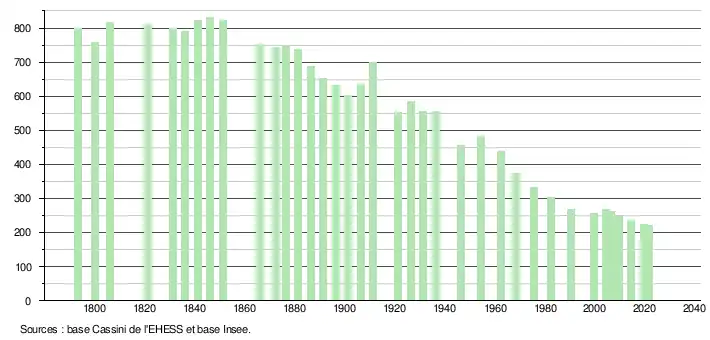 L'évolution du nombre d'habitants est connue à travers les recensements de la population effectués dans la commune depuis 1793. Pour les communes de moins de 10 000 habitants, une enquête de recensement portant sur toute la population est réalisée tous les cinq ans, les populations légales des années intermédiaires étant quant à elles estimées par interpolation ou extrapolation[31]. Pour la commune, le premier recensement exhaustif entrant dans le cadre du nouveau dispositif a été réalisé en 2004[32].