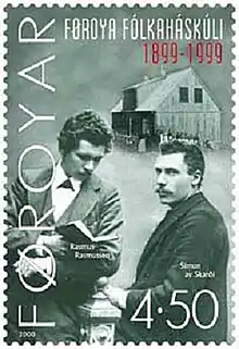 La Haute école populaire des îles Féroé est inaugurée à l’hiver 1899 à Klaksvík, sur l’île de Kunoy, dans des locaux provisoires mis à leur disposition par un commerçant du cru. Premier établissement scolaire où l’enseignement est dispensé en féroïen et non plus en danois, elle revêt une importance toute particulière pour la culture féroïenne. Símun av Skarði en sera le directeur jusqu’à sa mort le , soit au total pendant quarante-trois ans. En 1909, l’école est transférée à Tórshavn, la capitale, où une rue (Símunargøta) porte le nom de Símun af Skarði. À la différence d’autres noms de rues baptisées en l’honneur de Féroïens célèbres, c'est le prénom et non le nom de famille qui a été retenu. C'est également le cas de la Rasmusargøta, une rue parallèle baptisée en l’honneur de son ami Rasmus Rasmussen.