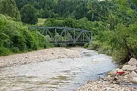 Vue de la rivière Sălăuța à la hauteur de la ville de Coșbuc coulant sous le pont de la voie ferrée.