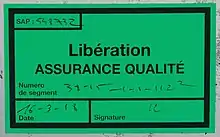 Référence SAP d'un article sur une étiquette verte d'assurance qualité fournisseur.