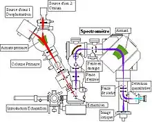 Un instrument SIMS comporte une colonne d'ions primaire qui produit sur l'échantillon à analyser une sonde d'ions primaires. La colonne primaire peut être équipée, comme pour les instruments IMS3f ou IMS6f de deux sources (oxygène et césium), produisant respectivement des ions d'éléments chimiques électropositifs ou électronégatifs . L'échantillon est porté à haute tension, et les ions secondaires sont accélérés vers un spectromètre de masse magnétique. Comme les ions SIMS ont souvent une dispersion en énergie élevée, il est nécessaire que le spectromètre de masse soit "à double focalisation", c'est-à-dire que la dispersion en énergie de l'aimant doit être compensée : c'est le rôle du secteur électrostatique qui produit une dispersion en énergie inverse de celle de l'aimant. Une optique ionique d'adaptation constituée de lentilles électrostatiques est disposée entre l'échantillon et la fente d'entrée du spectromètre. Le fait que le secteur électrostatique, sphérique, et l'aimant soient tous deux stigmatiques permet de transporter l'image de l'échantillon et de projeter une image ionique, filtrée en masse sur un dispositif de conversion ions-photons. Plus généralement, pour les analyses quantitatives, les ions secondaires sont acheminés sur des dispositifs détecteurs, multiplicateurs d'électrons ou cages de Faraday.
