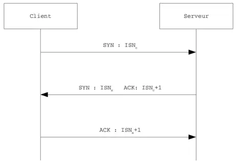 - SYN : le client désire se connecter au serveur TCP. Pour ce faire, il envoie un paquet SYN contenant un numéro de séquence initial, noté , en tant que numéro de séquence[11] ;
