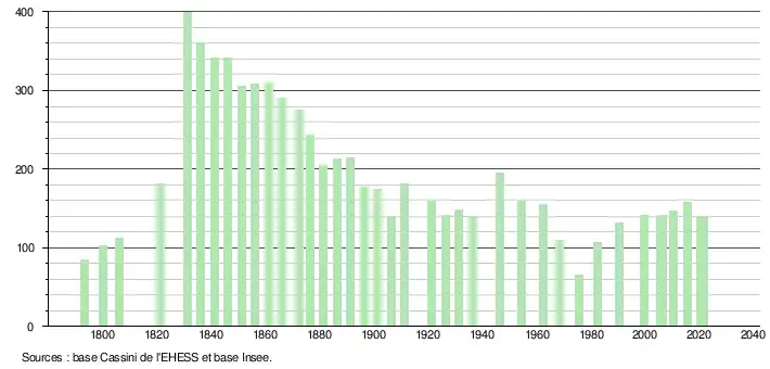 L'évolution du nombre d'habitants est connue à travers les recensements de la population effectués dans la commune depuis 1793. Pour les communes de moins de 10 000 habitants, une enquête de recensement portant sur toute la population est réalisée tous les cinq ans, les populations légales des années intermédiaires étant quant à elles estimées par interpolation ou extrapolation[19]. Pour la commune, le premier recensement exhaustif entrant dans le cadre du nouveau dispositif a été réalisé en 2005[20].