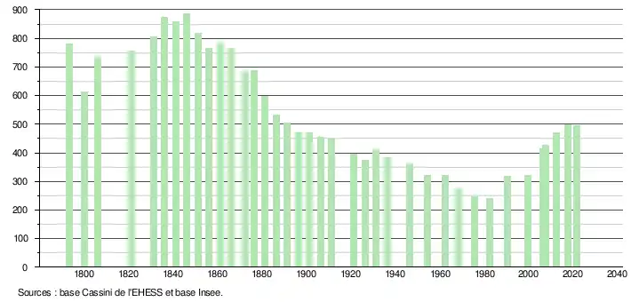 L'évolution du nombre d'habitants est connue à travers les recensements de la population effectués dans la commune depuis 1793. Pour les communes de moins de 10 000 habitants, une enquête de recensement portant sur toute la population est réalisée tous les cinq ans, les populations légales des années intermédiaires étant quant à elles estimées par interpolation ou extrapolation[22]. Pour la commune, le premier recensement exhaustif entrant dans le cadre du nouveau dispositif a été réalisé en 2007[23].