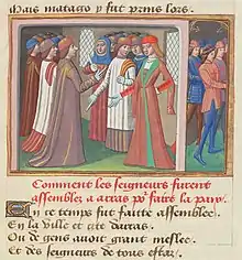 En 1465, Philippe le Bon est âgé et souffrant. Le , son fils Charles, alors comte de Charolais, connu de manière posthume sous le nom de Charles le Téméraire, est nommé lieutenant général de son père, officieusement régent de l'État bourguignon. En France, Louis XI est remis en question par la Ligue du Bien public dont Charles le Téméraire, pourtant cousin du roi, prend la tête. Les deux camps s'affrontent le lors de la Bataille de Montlhéry sans qu'on puisse vraiment déterminer de vainqueur. Louis XI envoie des messagers en pays liégeois pour y trouver alliance. Les messagers du roi attisent le feu de la haine ancestrale des cités liégeoise envers les Bourguignons[12]. Raes de Heers, qui est à la tête de la fronde liégeoise qui s'oppose au Prince-évêque, Louis de Bourbon, obtient le soutien du roi de France. Louis de Bourbon est démis de ses fonctions en 1465 et remplacé par Marc de Bade.