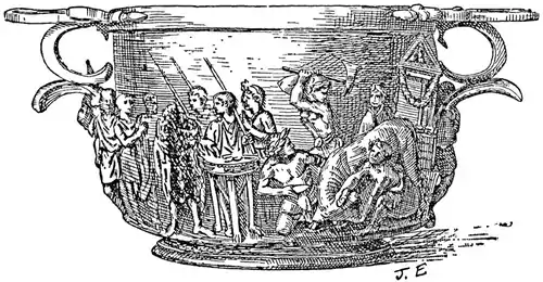 - Cette scène est souvent interprétée comme un sacrifice à Teutatès, mais parfois aussi comme un rite comparable au baptême ou comme un rite symbolique (représentation d'un mythe de renaissance). D'après Christian-Joseph Guyonvarc'h, Le sacrifice dans la tradition celtique : les rites, la doctrine et les techniques, Éditions Armeline, , p. 239.