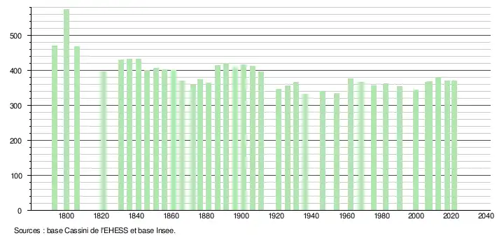L'évolution du nombre d'habitants est connue à travers les recensements de la population effectués dans la commune depuis 1793. Pour les communes de moins de 10 000 habitants, une enquête de recensement portant sur toute la population est réalisée tous les cinq ans, les populations légales des années intermédiaires étant quant à elles estimées par interpolation ou extrapolation[15]. Pour la commune, le premier recensement exhaustif entrant dans le cadre du nouveau dispositif a été réalisé en 2007[16].