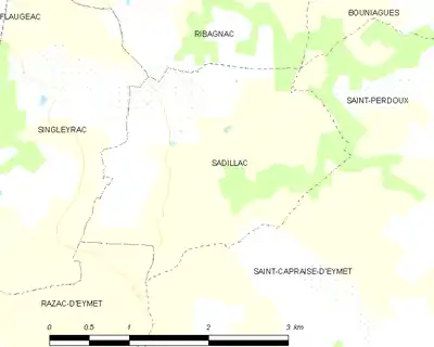 Sadillac est limitrophe de six autres communes, dont Bouniagues au nord-est par un quadripoint au lieu-dit les Trois Tables.