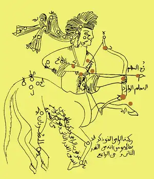 Quand les astronomes arabes ont repris le formage du ciel opéré par les Grecs, Τοξότης, l'« Archer », ils l’ont nommé الرامي al-Rāmī, « le Tireur à l’arc ». Mais ils connaissaient déjà, venu directement de Mésopotamie par l‘araméen Qešta, « l’Arc », القوس al-Qaws, qui était le nom du 9e signe du zodiaque, attesté dans l’horoscope de fondation de la ville de Baghdad en 762, ainsi que nous rapporte l’érudit persan al-Bīrūnī[10]. Ces deux noms sont ainsi utilisés pour la figure du Sagittaire, ce qui se retrouve dans des noms d’étoiles empruntés aux Arabes.