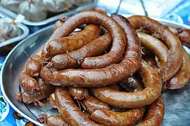 - Sai oua krouaille ou sai oua kwai (Luang Prabang) : une saucisse de buffle grillée, noire et épicée[6].