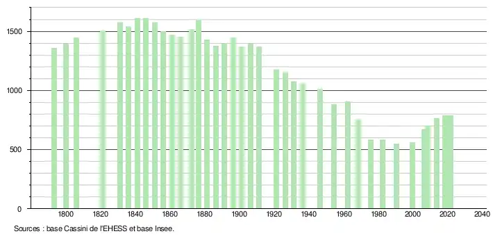 L'évolution du nombre d'habitants est connue à travers les recensements de la population effectués dans la commune depuis 1793. Pour les communes de moins de 10 000 habitants, une enquête de recensement portant sur toute la population est réalisée tous les cinq ans, les populations légales des années intermédiaires étant quant à elles estimées par interpolation ou extrapolation[20]. Pour la commune, le premier recensement exhaustif entrant dans le cadre du nouveau dispositif a été réalisé en 2008[21].