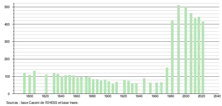 L'évolution du nombre d'habitants est connue à travers les recensements de la population effectués dans la commune depuis 1793. Pour les communes de moins de 10 000 habitants, une enquête de recensement portant sur toute la population est réalisée tous les cinq ans, les populations légales des années intermédiaires étant quant à elles estimées par interpolation ou extrapolation[21]. Pour la commune, le premier recensement exhaustif entrant dans le cadre du nouveau dispositif a été réalisé en 2006[22].