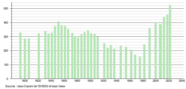 L'évolution du nombre d'habitants est connue à travers les recensements de la population effectués dans la commune depuis 1793. Pour les communes de moins de 10 000 habitants, une enquête de recensement portant sur toute la population est réalisée tous les cinq ans, les populations légales des années intermédiaires étant quant à elles estimées par interpolation ou extrapolation[21]. Pour la commune, le premier recensement exhaustif entrant dans le cadre du nouveau dispositif a été réalisé en 2007[22].