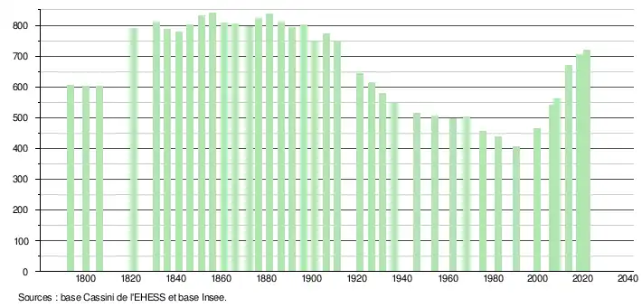 L'évolution du nombre d'habitants est connue à travers les recensements de la population effectués dans la commune depuis 1793. Pour les communes de moins de 10 000 habitants, une enquête de recensement portant sur toute la population est réalisée tous les cinq ans, les populations légales des années intermédiaires étant quant à elles estimées par interpolation ou extrapolation[25]. Pour la commune, le premier recensement exhaustif entrant dans le cadre du nouveau dispositif a été réalisé en 2008[26]. En 2021, la commune comptait 719 habitants[Note 4], en augmentation de 2,42 % par rapport à 2015 (Landes : +4,9 %, France hors Mayotte : +1,84 %).