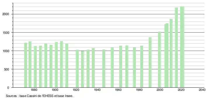 L'évolution du nombre d'habitants est connue à travers les recensements de la population effectués dans la commune depuis 1872. Pour les communes de moins de 10 000 habitants, une enquête de recensement portant sur toute la population est réalisée tous les cinq ans, les populations légales des années intermédiaires étant quant à elles estimées par interpolation ou extrapolation[23]. Pour la commune, le premier recensement exhaustif entrant dans le cadre du nouveau dispositif a été réalisé en 2005[24].